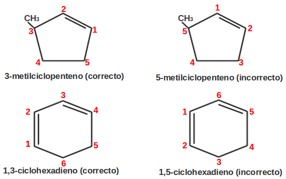 Para nombrar los cicloalquenos se asignan los localizadores 1 y 2 a los carbonos del doble enlace. La dirección de numeración se elige de manera de dar los menores localizadores a los sustituyentes del anillo. Para indicar la posición de ramificaciones u otros enlaces dobles se escoge el sentido de numeración que conduzca a la numeración más pequeña. Ya que el doble enlace siempre está en posición 1 no es necesario especificarlo en el nombre.