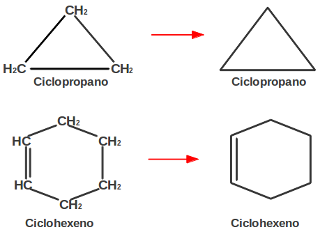 Usualmente estos compuestos (los de cadena cerrada que pueden ser ciclobutano, ciclohexano, cicloctano, ciclobuteno) se representan por su figura geométrica, omitiéndose los átomos de hidrógenos. De esta manera, cada vértice denota un átomo de carbono.