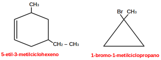 Los cicloalcanos y cicloalquenos forman cadenas cerradas o anillos. Se clasifican en monocíclicos, si constan de un solo anillo. Los monocíclicos no sustituidos, es decir que no tienen sustituyentes, se nombran agregando el prefijo ciclo al nombre del alcano lineal con el mismo número de átomos de carbono. Ejemplos: