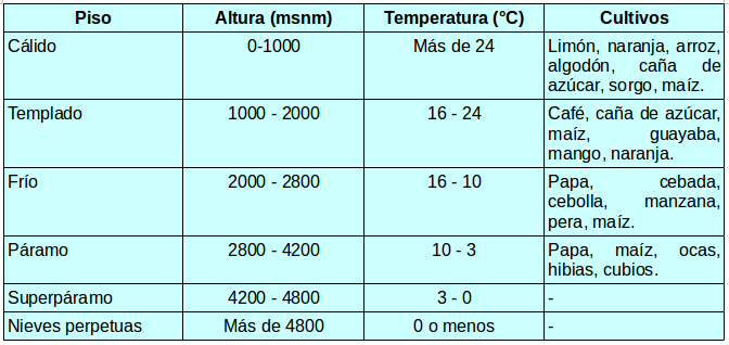 El factor principal de variación de la temperatura en nuestro país es la altitud respecto al nivel del mar. Tal como puedes observar en la tabla, la temperatura se hace más fría a medida que ascendemos. Podemos, entonces, clasificar las diferentes alturas como pisos térmicos. Cada piso térmico tiene, por consiguiente, un rango de temperatura que lo caracteriza, así como poblaciones de animales y vegetales típicas.