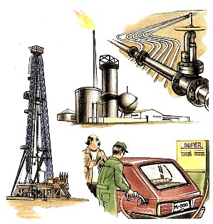 Petróleo: Es un líquido viscoso y oscuro que se encuentra en el subsuelo, algunas veces a gran profundidad, de donde se extrae por medio de perforaciones. El petróleo crudo se somete a una destilación fraccionada o por etapas, que consiste en calentarlo a distintas temperaturas en orden creciente, con lo cual se consigue que se desprendan primero los vapores de los productos más volátiles. La gasolina, hasta 180 ºC; hasta 280 ºC se desprende el queroseno o petróleo industrial; el gasóleo a los 350 °C, los aceites de engrase y el fuel-oil se obtienen utilizando temperaturas más elevadas y, por último, queda el alquitrán como subproducto final.
