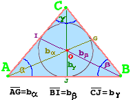 Un triángulo tiene \(3\) bisectrices, uno por cada ángulo y se designan normalmente por la letra b y un subíndice que señala el respectivo ángulo interior.