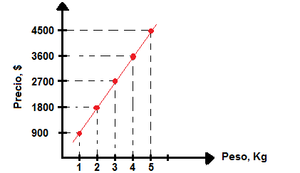 Ahora representemos gráficamente los pares de valores (peso en kilográmos y precio):