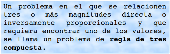 Para la resolución de un problema de regla de tres compuesta pueden usarse proporciones o procedimientos asociados a la proporcionalidad directa o inversa, según corresponda.