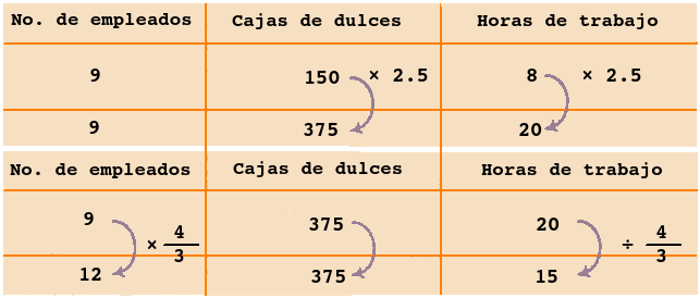 EJEMPLO 2: En una dulcería tienen \(9\) empleados que, trabajando \(8\) horas, hacen y empacan \(150\) cajas de dulces. ¿Cuántas horas tardarán \(12\) empleados en hacer y empacar un pedido de \(375\) cajas?
