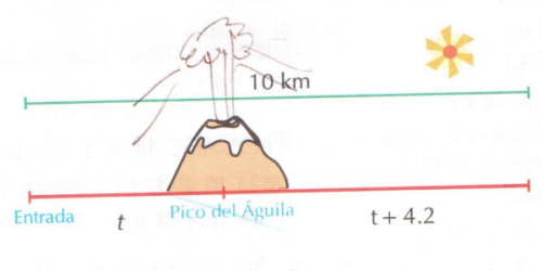 →Si la distancia desde la entrada hasta el pico es \(4,2\ km\) menos que el resto del recorrido, el último tramo mide \(t + 4,2 \ km\).