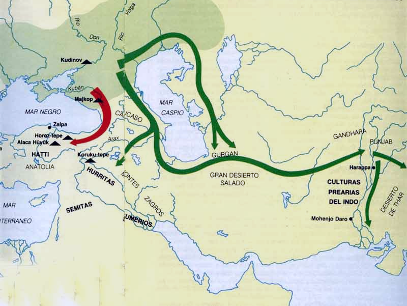 Hacia el 1400 a. de C. las ciudades de Harappa y Mohenjo-Daro fueron destruidas (y con ellas gran parte de su cultura) por la invasión de nómadas indoeuropeos, que se impusieron a los drávidas. Esta nueva étnia extendió su dominio hacia el Ganges pero apenas entró en el Decán, que quedó ocupado por pobladores dravídicos.