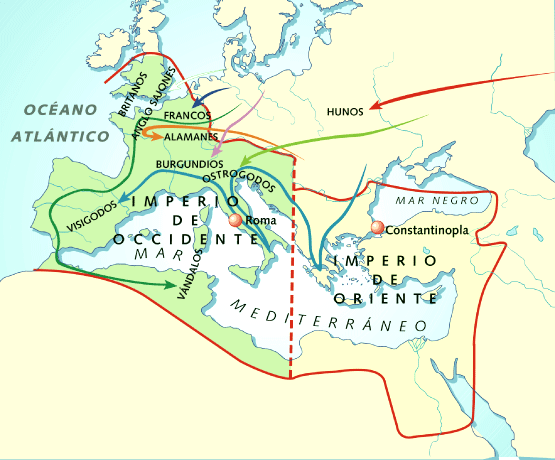 Por su destreza y disciplina militares, nadie fue capaz de detenerlos y desplazaron a todos los que encontraron a su paso. Provocaron así una oleada de migraciones, ya que los pueblos huían antes de que llegaran para no encontrarse con ellos. Este efecto dominó de grandes masas bordeó el frente impenetrable que representaba Constantinopla y el Imperio romano de Oriente, extendiéndose por las orillas del Danubio y el Rin hasta que aplastaron el Imperio romano de Occidente en el año 476.