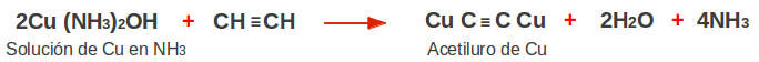 Cuando esta reacción ocurre con metales pesados como el cobre por ejemplo, se produce el acetiluro de cobre y se libera amoníaco y agua.