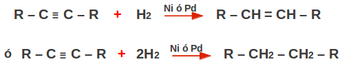 Hidrogenación: los alquinos por hidrogenación catalíticaya sea en presencia de níquel o de paladio, puede adicionar hasta dos moléculas de hidrógeno. Cuando se adiciona el primer mol, la reacción da origen a los alquenos correspondientes; pero si se adicionan los dos moles de hidrógeno, se obtendran los alcanos. Ejemplo: