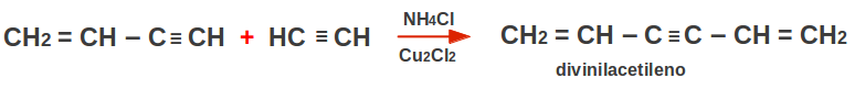 El acetileno puede sufrir dimerización dando el divinilacetileno, cuando reacciona con vinilacetileno: