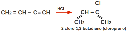 Esta es una reacción muy importante pues al tratar el vinilacetileno con cloruro de hidrógeno en forma muy cuidadosa, se produce el 2-cloro-1,3-butadieno: