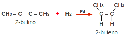 El mol de hidrógeno entra en posición cis, es decir por el mismo lado; no hay por tanto formación de isómeros trans. Por ejemplo, la hidrogenación del 2-butino: