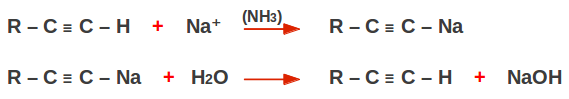 Formación de derivados metálicos: cuando se tratan los alquinos con el sodio, potasio o litio en amoníaco, se originan sales que tratadas con agua vuelven a regenerar el alquino en cuestión. Esto indica que los hidrógenos próximos al enlace triple, especialmente del acetileno, son de carácter ácido débil.