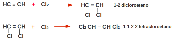 Adición de halógenos: cuando se hace reaccionar especialmente el cloro y el bromo con el acetileno, se pueden adicionar uno o dos moles de halógeno. Sin embargo el yodo sólo adiciona una molécula. Ejemplo:
