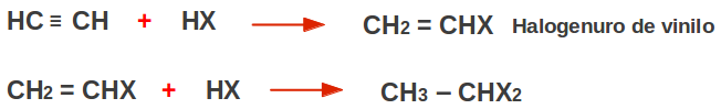 Adición de halogenuros de hidrógeno: al tratar el acetileno con el yoduro o bromuro de hidrógeno, el acetileno adiciona dos moles del halógeno siguiendo la regla de Markownicoff. Durante la reacción de adición de dos moles, cuando se adiciona el primer mol de reactivo, la reacción se puede aislar obteniédose los productos intermedios como en el caso del halogenuro de vinilo.