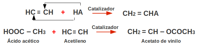 Vinilación: esta es una de las reacciones más importantes desde el punto de vista industrial, debido a que los vinilos son la base de muchos plásticos y cauchos sintéticos. La reacción se lleva a cabo tratando el acetileno con sustancias que tengan en su estructura hidrógenos un poco ácidos, lo cual da como resultado la formación de compuestos vinílicos. Ejemplo: