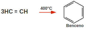 Polimerización: cuando se somete el acetileno a altas temperaturas aproximadamente 400°C, origina el benceno: