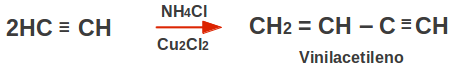 También el acetileno puede polimerizarse linealmente en presencia del Cu2Cl2 y NH4Cl para producir el vinilacetileno: