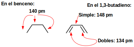 Hechos experimentales relativamente recientes indican que las distancias carbono-carbono en la molécula del benceno son exactamente iguales, en contradicción con la fórmula de Kekulé que presentan enlaces simples y dobles, cuya longitud es diferente. En efecto, se conocen los siguientes valores:
