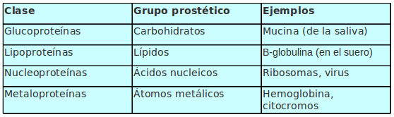 Las proteínas conjugadas, por su parte, contienen otros grupos estructurales unidos a la cadena proteínica simple, los cuales reciben el nombre genérico de grupos prostéticos. Dependiendo de la naturaleza de dichos grupos, las proteínas reciben diferentes denominaciones.
