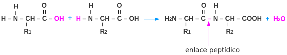 En la conformación de la proteína, las moléculas de los aminoácidos se unen entre sí por medio de enlaces covalentes conocidos como enlaces peptídicos, que se establecen entre el grupo carboxilo de un aminoácido y el grupo amino de otro. Por ejemplo: