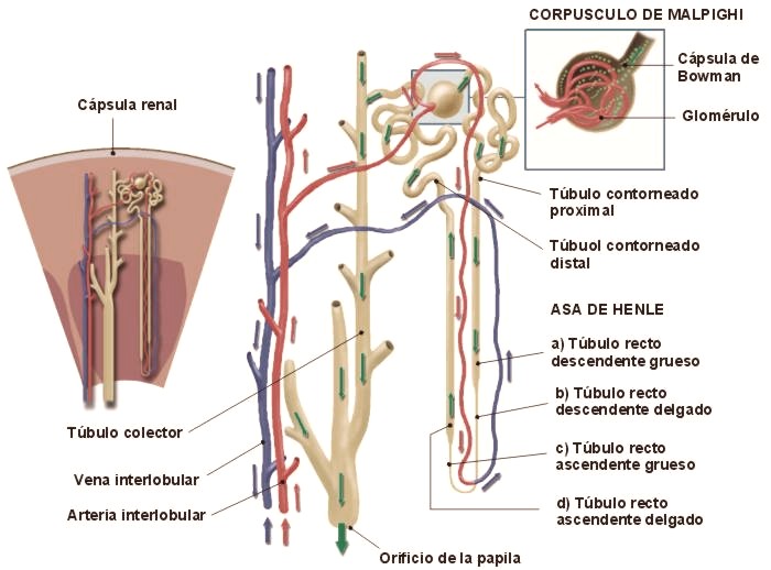La sangre penetra al riñón por medio de la arteria renal, que se va subdividiendo en arteriolas cada vez más pequeñas. Estas entran a la capsula Browman, formando el glomérulo. El glomérulo es la unión de varios capilares sanguíneos y esta cubierto de un epitelio muy fino, que permite que se lleva a cabo el proceso de filtración.