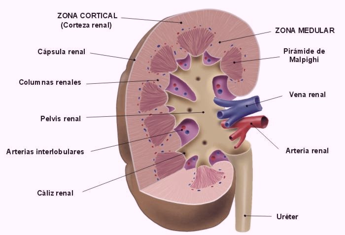 En cada riñón se observan tres zonas: la corteza renal, Ia médula renal y la pelvis renal. La pelvis se encarga de recibir la orina producida por las nefronas, y dirigirla hacia los uréteres para que sea eliminada del cuerpo. Dentro de los riñones, se ramifica en estructuras de aspecto fibrosa, cuyo conjunto conforma la médula. La médula se encuentra rodeada por la corteza, que tiene aspecto granuloso.