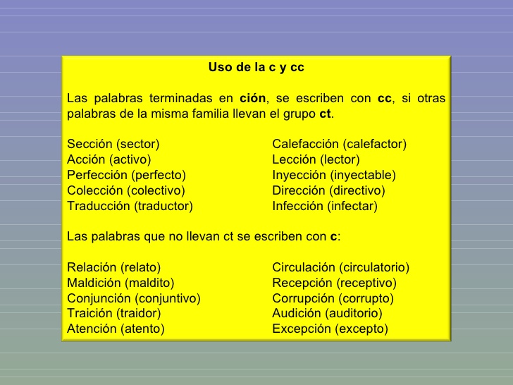 Se escribe con "cc" cuando en alguna palabra de la familia léxica aparezca el grupo "ct". Ejemplos: adicción (adicto), reducción (reducto).