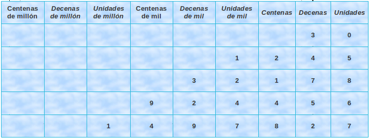 Observe en el cuadro anterior, que el primer valor que aparece es el número treinta (30) el cual tiene en la posición de las unidades el dígito 0 y en la posición de las decenas el dígito 3. Así que la cantidad de un número decimal depende de l número de dígitos que tiene para representar cierta cantidad.
