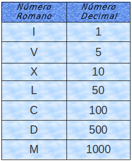 A continuación mostraremos una tabla que relaciona los números Romanos con el sistema que nosotros manejamos, el sistema decimal.