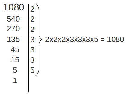 El número es igual al producto de los factores primos obtenidos. Practiquemos, realice la descomposición en factores primos del valor \(1080\).Solución: Al desarrollar la descomposición en factores primos el resultado que a usted le debió dar es el siguiente: