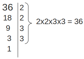 Para descomponer un número, por ejemplo \(36\), en factores primos se siguen los siguientes pasos: Se escribe el número a la izquierda de una raya vertical y a su derecha el menor número primo (2, 3 5, 7,... ) por el cual dicho número sea divisible. El cociente obtenido se coloca debajo del número propuesto (36). 2° Se procede como en el paso anterior con el cociente obtenido (18), y así sucesivamente hasta llegar a un cociente igual a \(1\).
