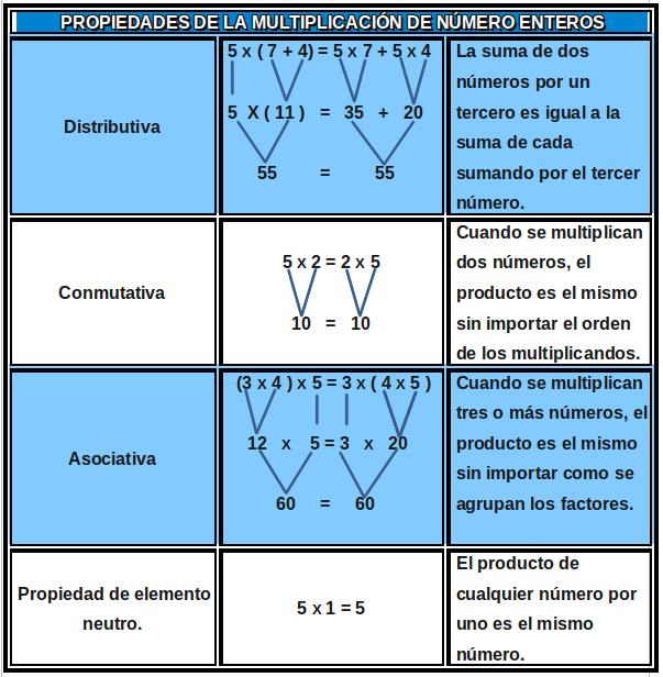 La multiplicación tiene cuatro propiedades que harán más fácil la resolución de problemas. Estas son las propiedades conmutativa, asociativa, elemento neutro y distributiva.