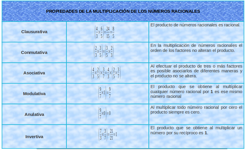 A continuación se mostraran en el cuadro las propiedades que se cumplen de la multiplicación de números racionales.