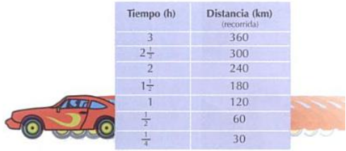 En la tabla anterior encuentra algunos cocientes entre la distancia recorrida por el auto movil y el timpo empleado.
