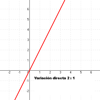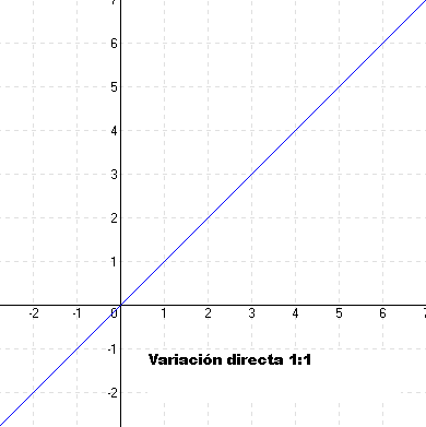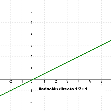 Ejemplo 3: La constante de proporcionalidad es ½:Por cada unidad que aumenta la variable del eje horizontal, la variable en el eje vertical aumentará media unidad. Igual proceso se daría si se disminuyera la variable del eje horizontal, lo cual haría que la variable del eje vertical disminuyera media unidad.