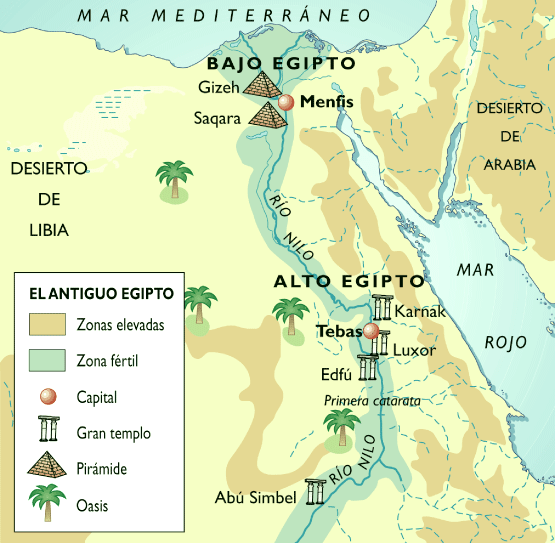 Encerrado entre el mar y el desierto, corre el río Nilo formando un valle en donde floreció una de las civilizaciones más interesantes y misteriosas del antiguo mundo. Los pueblos que habitaron a lo largo del curso del río Nilo estaban formados por grupos procedentes de diferentes partes. Esta población en su mayoría se concentró en dos zonas denominadas; Alto Egipto y Bajo Egipto. Allí se desarrollaron dos estados independientes.