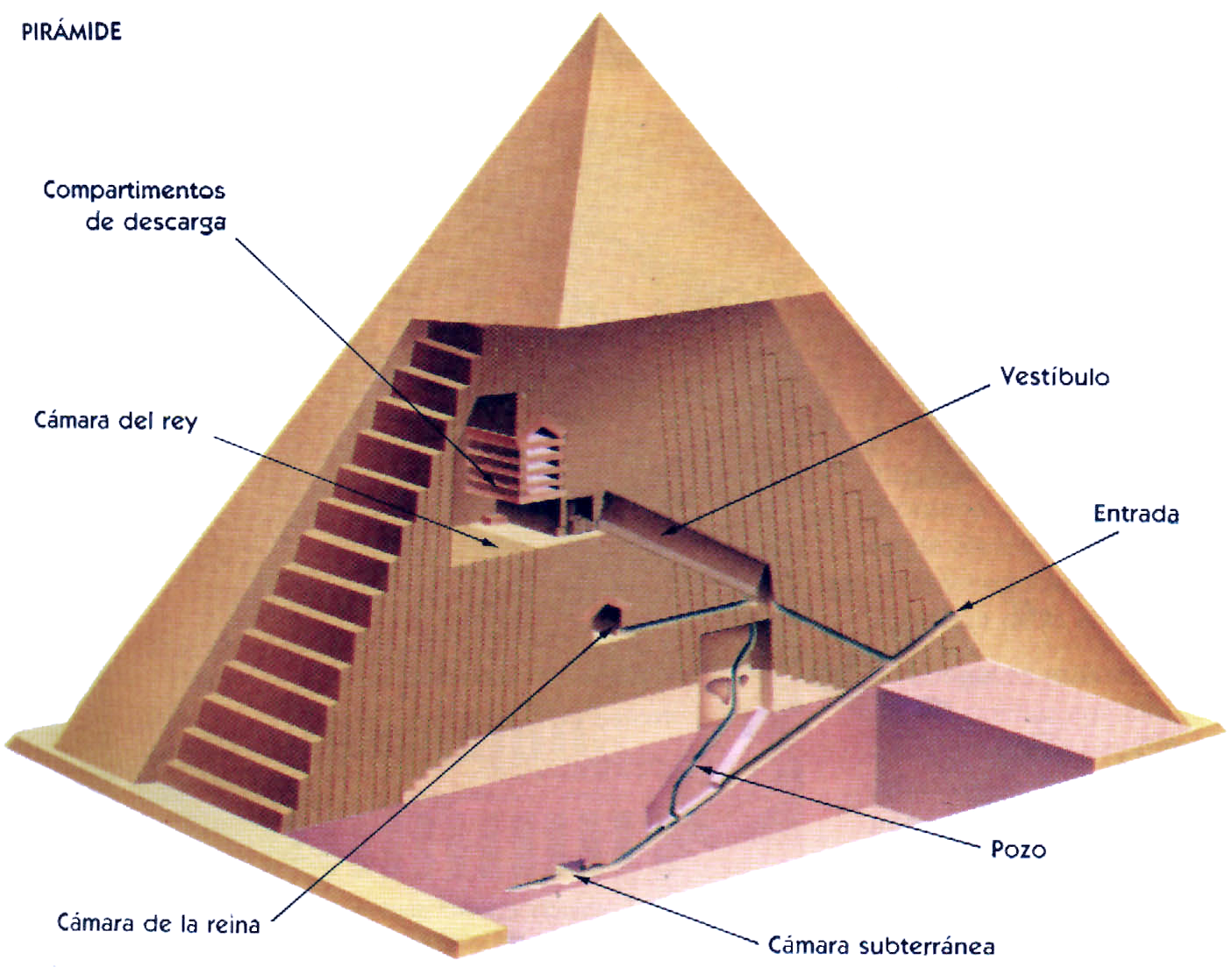 En Egipto se encuentran las grandes pirámides que aun guardan muchos misterios. Estos monumentos eran signos de prosperidad económica y le daban el sentido de perpetuidad a los monarcas. Eran recintos funerarios para la vida de ultra tumba. La más conocidas por su colosal tamaño son las de Keops, Kefrén y Micerino, nombres de los faraones padre, hijo y nieto, que las mandaron a construir. Junto a las pirámides se halla el templo solar, dedicado al culto de este astro.