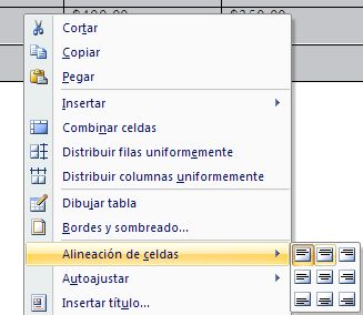 5.Otra manera de centrar la información que presentamos en cada una de las celdas. Es sombrear nuevamente toda la tabla y pulsamos el botón derecho del ratón, se abrirá una ventana con diferentes opciones. Nos ubicamos en Alineación de celdas y se abrirá una ventana que muestra gráficamente las opciones. Para el ejemplo seleccionamos Centrar.