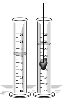 La diferencia de nivel determina el volumen de la piedra, 3 ml ó 3 cm3 o 3 cc (3 centímetros cúbicos), en este caso. Ya que la piedra no absorbe agua, el espacio que ocupa la piedra desplaza el agua hacia arriba y, de esta manera es posible determinar su volumen.