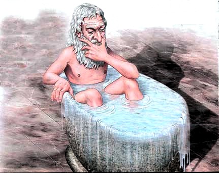 Se dice que mientras se disponía a bañarse en una tina, en la que por error había puesto demasiada agua, al sumergirse en ella, parte del agua se derramó. Arquímedes se dio cuenta de que este hecho podía ayudarle a resolver el enigma planteado por Herón y fue tal su regocijo que, desnudo, salió corriendo de la tina gritando "¡Eureka, eureka!" (que significa "¡Lo encontré, lo encontré!").