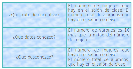 Ejemplo 1: El número de varones que hay en el salón de clase es diez más que la mitad del número de mujeres. Si hay \(19\) varones, ¿Cuántas mujeres hay en el salón? ¿Cuántos alumnos, entre hombre y mujeres, hay en el salón de clase?