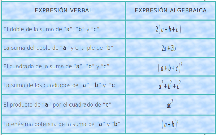 Si “a”, “b” y “c” son números reales, para cada expresión verbal encontremos su respectiva expresión algebraica.