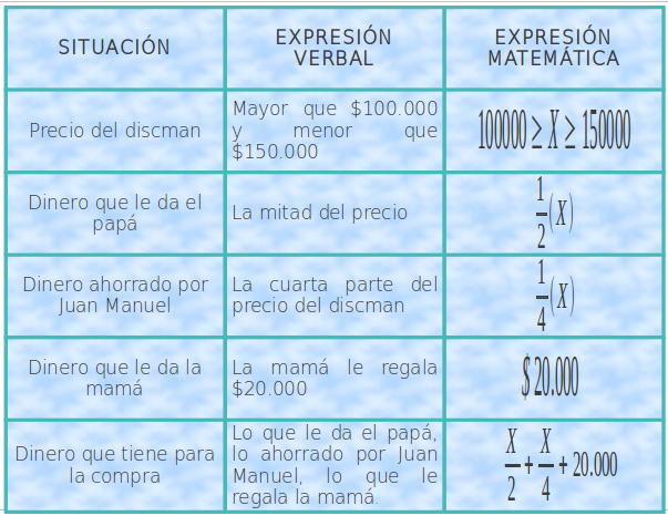 Si el precio desconocido del discman se representa con la letra “x”, las diversas situaciones enunciadas en el problema también se puede expresar con ella y con números, tal como lo muestra la tabla: