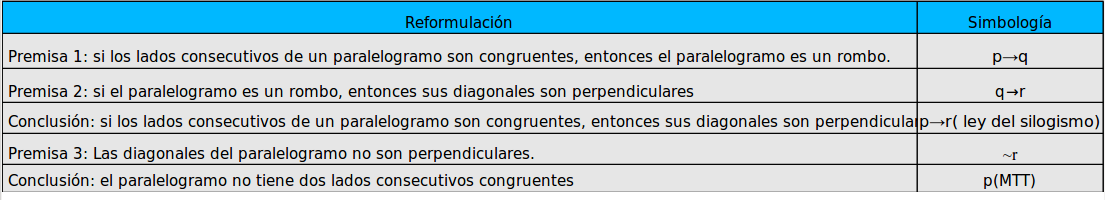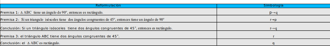 Es decir: si están dadas las proposiciones p→q y q→r, se concluye lógicamente que p→r: