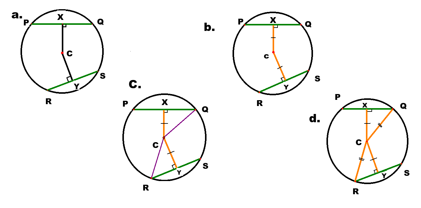 Dibujemos una circunferencia y dos cuerdas que parezcan congruentes.¿Cómo podemos estar seguros que lo son ? ¿Qué relación hay entre la longitud de las cuerdas y su distancia del centro ? Recordemos que la distancia entre un punto y una recta es la longitud del segmento perpendicular desde el punto hasta la recta. Comparemos las conclusiones a las que llegamos con los siguientes teoremas.