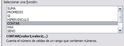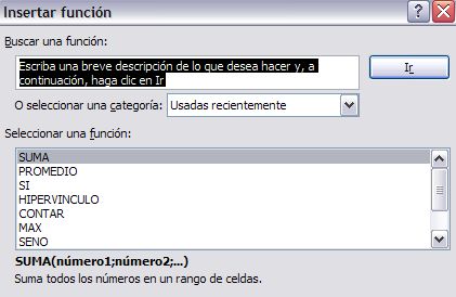 Si vemos la imágen anterior, se presentan las Funciones Usadas recientemente. Sin embargo, podríamos seleccionar otra categoría.